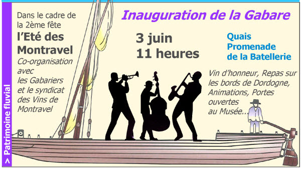 3 June 11h : Inauguration of the Gabare in Montravel (I think!) Might be Porte Ste Foy? Anybody know more?
